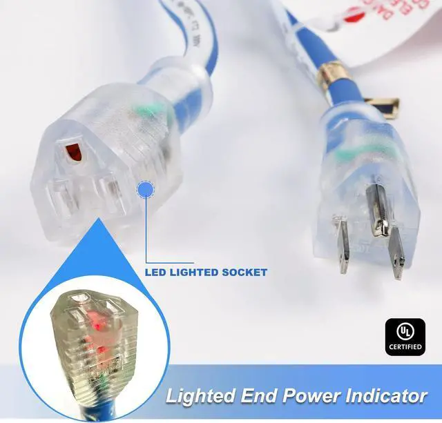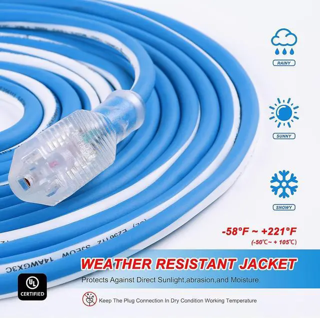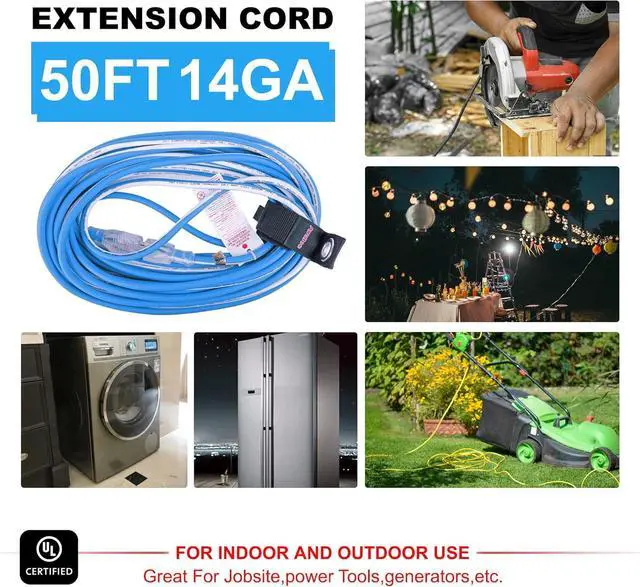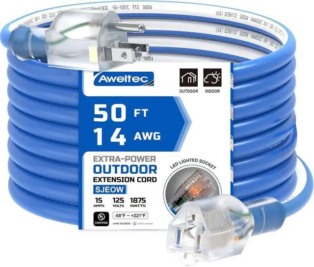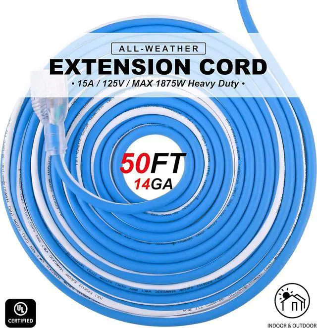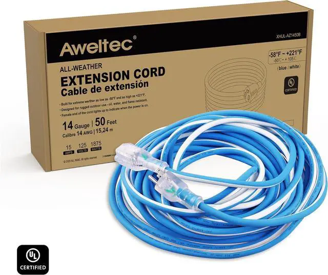Works in temperatures from -58°F up to +221°F, 14gauge UL listed, 3 wire 50 ft weather extension cord, 15 amp, 125 volt, 1875 watt