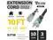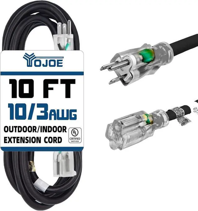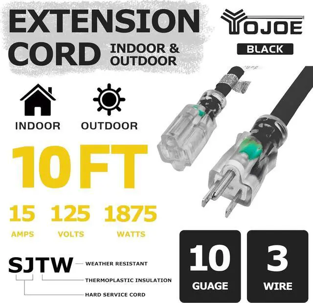 : This 10FT Black extension cord features a lighted end that indicates when power is active. 10 gauge extension cord, 3-prong grounded plug, and supports 15 amps, 125 volts, and 1875 watts. It operates effectively within a Temperature Range of -40°F to +140°F.