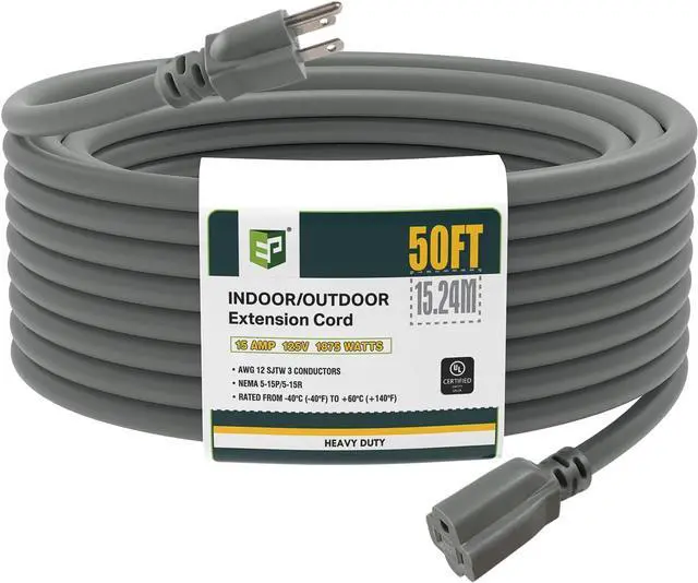 EP 50 Ft Outdoor Extension Cord, 12/3 SJTW Heavy Duty Extension Cable with 3 Prong Grounded Plug, 15 AMP Power Cord for Lawn, Garden, Appliances, Gray
