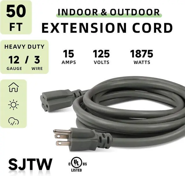 • Heavy Duty Extension Cord - 15 amps, 125 volts, 1875 watts, 5-15P/R, 12 gauge heavy duty cord with pure copper wire.