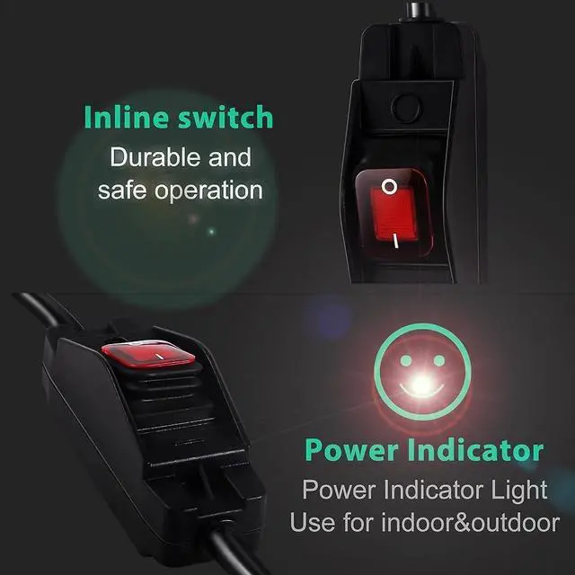 Wide Compatibility Grounded OutletsGreat Compatibility: Our versatile outlets waterproof extension cord with waterproof on off switch is suitable for a wide range of standard electrical equipment, including light strings, lamps, printers, patio fountain, printers and other standard indoor and outdoor electrical equipments. This ensures its suitability for various indoor and outdoor applications. The 3 prong extension cord is equipped with powerful 15A 125V NEMA 5-15P to NEMA 5-15R grounded outlet plugs.