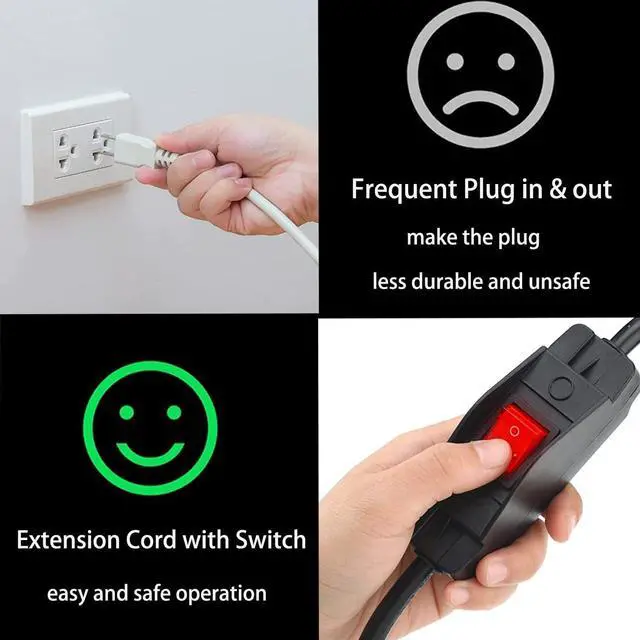 Easy to OperateOur water proof outdoor extension cord with inline on off switch is designed for effortless operation. Just use the switch or the outlets themselves to turn your appliances on and off. Which is great use with most standard appliances and electrical devices, including lights, printers and electrical devices. By putting the plug into the socket, and you can plug in the appliance you want on the other male to female end, and control it through the matched switch. The included LED waterproof switch allows convenient control of the power supply, providing a hassle-free experience for users.