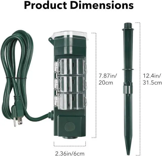 Weatherproof outdoor outletThis outdoor yard stake comes with a 12-inch green stake that blends with your garden/lawn. It can withstand quite the snowfall, wind, and heavy rain. And each outlet is safeguarded by an individual waterproof cover, ensuring watertight protection. With a robust design and construction using waterproof materials, this outdoor Power Strip withstands harsh weather and freezing conditions, making it ideally suited for outdoor usage.