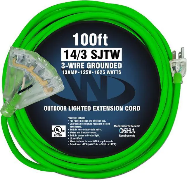 Outdoor Extension Cord SJTW: Our heavy duty power cords are made with an SJTW jacket which is suitable to temperatures from -40°F to 130°F. This waterproof extension cord can be used in rain or shine. *Keep connection points dry.