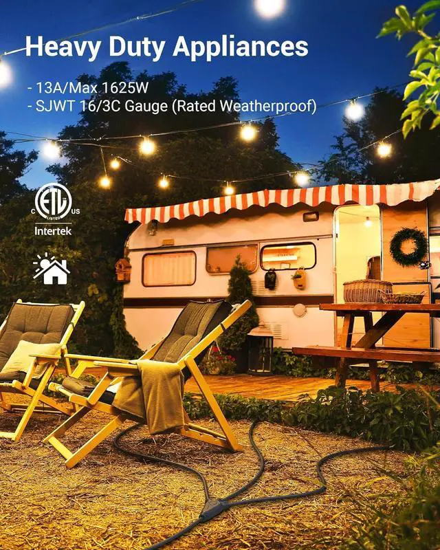 [1 to 3 Splitter & Wide Application] This short outdoor extension cord is convenient to connect 3 appliances together with a 1 to 3 splitter (maximum length 6ft on each splitter), avoiding multiple extension cords placed in a haphazard manner; ideal for outdoor lights, electrical appliances, holiday decorations, inflatable products