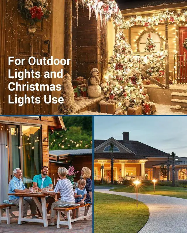 [Total 12FT Extension Cord] Total 12ft (3' +3' +3' +3' ) devided into four parts, which the main power supply is 3ft from the plug to the 3 splitters and each branch is 3ft from the connector; outdoor triple extension cord minimizes the number of extension cords required, making landscape lighting and Christmas decorating a breeze
