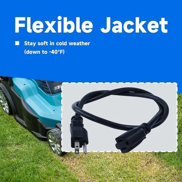 Safety and Durability - UL Listed for safety, this extension powercord features a 3-prong grounded plug and reinforced blades to prevent bending or breaking. It remains flexible in all weather conditions, ensuring longevity without stiffening or cracking even in cold weather.