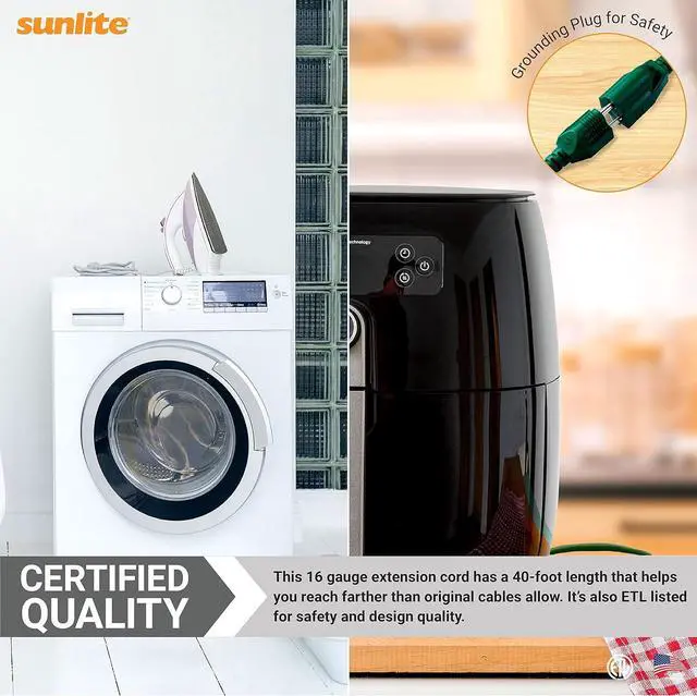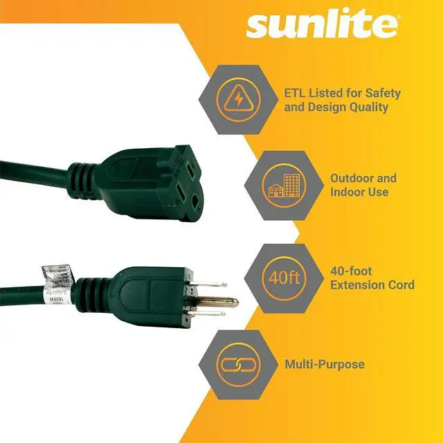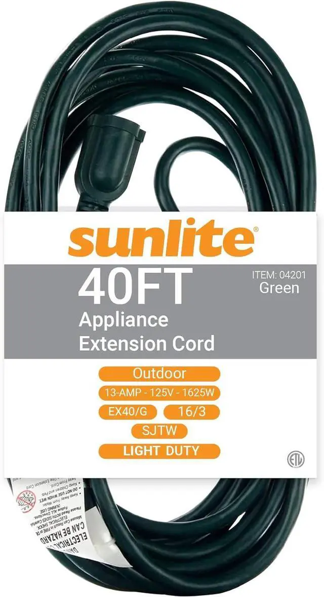 LIGHT DUTY EXTENSION CORD - Power cord too short? No Problem! Sunlite 1625 Watt household extension cords help you reach the outlet when the cord won' t. Features three prong polarized outlets.
