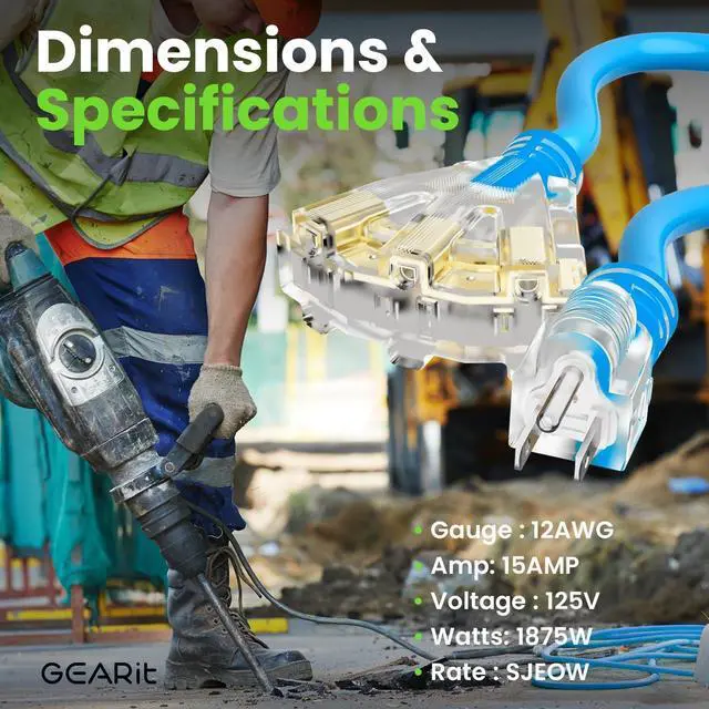 GEARit 12/3 Outdoor Extension Cord - Use this 100-foot outdoor extension cord with triple 3-prong connectors to reach power tools, gardening appliances, snow throwers and other power-hungry pieces of equipment wherever you need them, from front yards to professional construction sites, in all weather conditions thanks to the SJEOW jacket design.