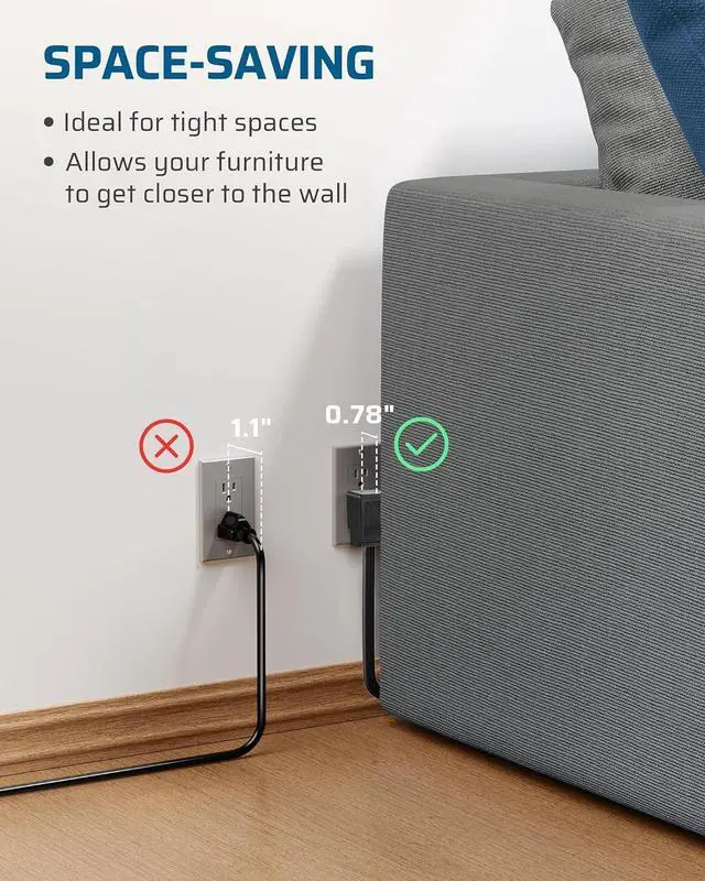 [Space-Saving Flat Plug] Featuring a 6-foot long power cord with a flat plug design, this flat extension cord effectively saves space and easy to plug and unplug; in tight spaces, it fits perfectly against the wall and hidden behind furniture such as sofa, bedside table, cabinet, and dresser, keeping your home neat and beautiful