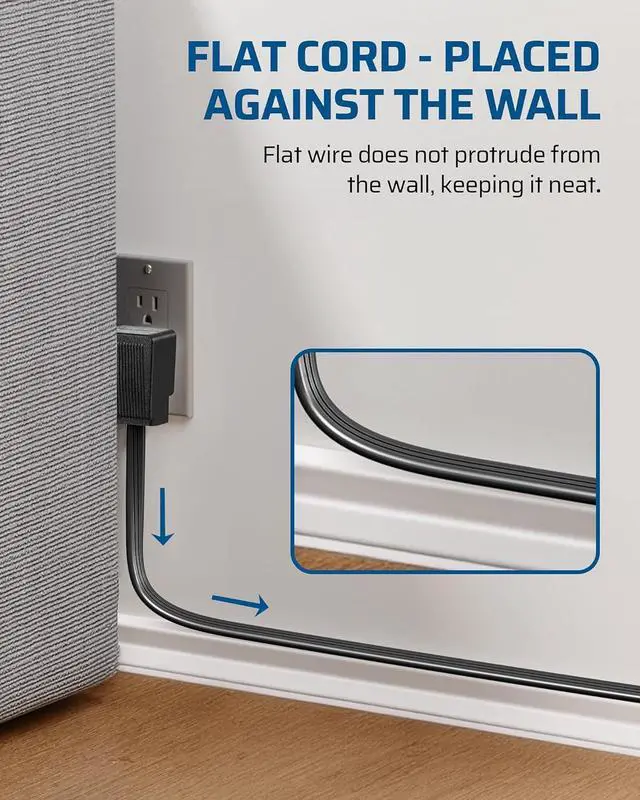 [Ultra-Thin Flat Cord] The flat power strip boasts an ultra-thin flat cord just 0.19 inches thick, allowing it to be placed flush against walls or even hidden under carpets, reducing the risk of tripping; it can flexibly pass under doors, making it suitable for use in living rooms, bedrooms, and offices