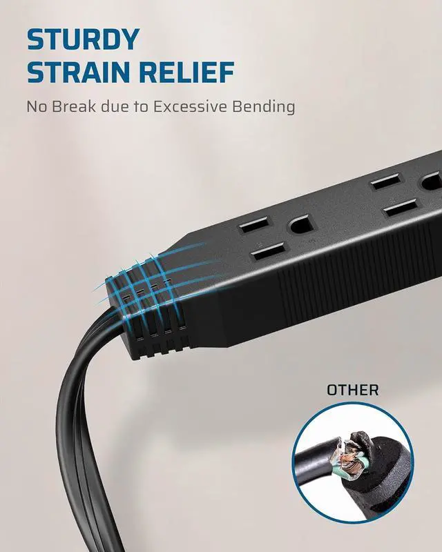 [Sturdy Strain Relief & ETL Certification] This 3 prong power strip has undergone rigorous ETL safety certification, the specially reinforced strain relief design ensures stability and safety even with frequent movement or adjustments in daily use, significantly extending the lifespan of the power strip