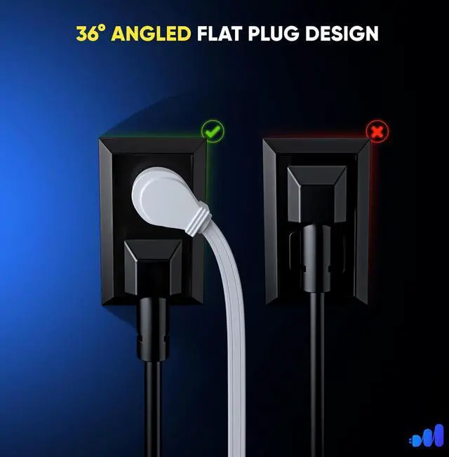Angled Plug Design: Can fit in tight spaces and prevent other outlets from being blocked, fits behind your desk, couch, bookshelf, kitchen appliances, and more