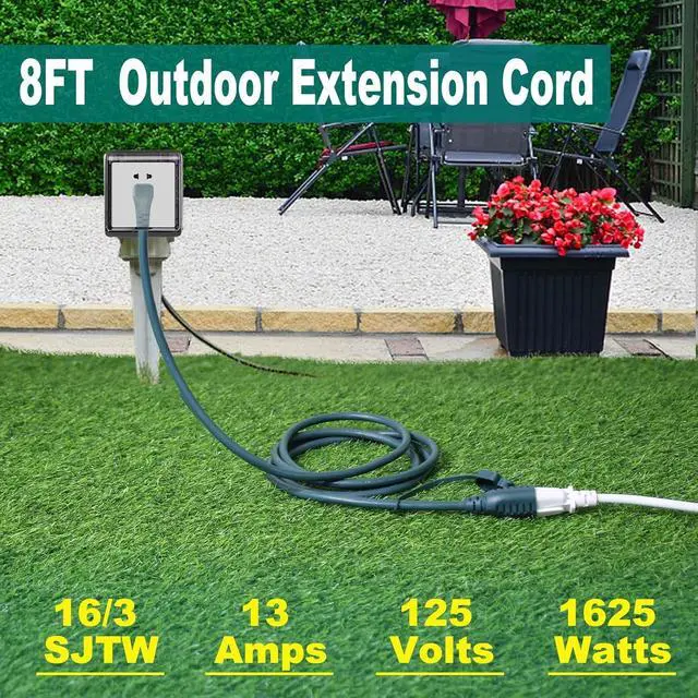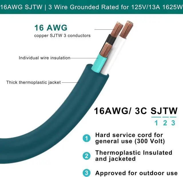 EXTENSION CORD FOR OUTDOOR USEThe extension cord is made of 16 AWG (American Wire Gauge) SJTW (Service Junior Thermoplastic Weather) rated cable, which is suitable for rugged outdoor use. It is designed to withstand various weather conditions, including rain, sunlight, and snow, thanks to its waterproof design.