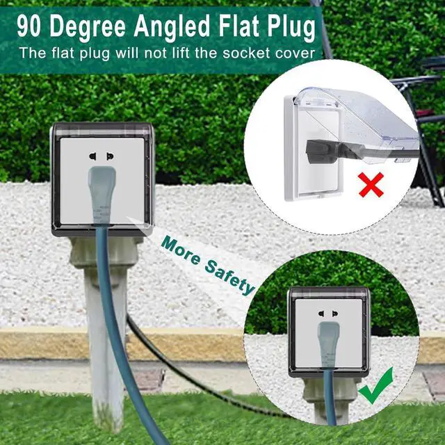 90-DEGREE FLAT PLUG When you use our products at home, the 90-degree bend allows you to plug into the back of the narrow sofa and TV cabinet, giving you more space possibilities. When you use it in the yard, the 90 degree plug will not lift the waterproof cover of your outlet. Ensure more secure use.
