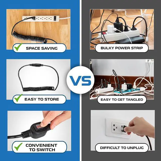 Reliable Outdoor Extension Cord: This Coiled Extension Cord 3 prong features a black coiled design, providing 8.5 ft when fully stretched and 3 ft unstretched with total of 10 ft of copper wires (before coiled). Suitable for both indoor and outdoor use. Great for Outside Lights Decor