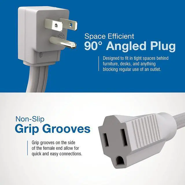 FLAT SPACE EFFICIENCY - 90-degree angle plug allows the flat extension cord to remain flush to the wall. Designed to fit in tight spaces behind furniture, bookshelves, desks, and anything blocking regular use of an outlet. Maximize floor space.
