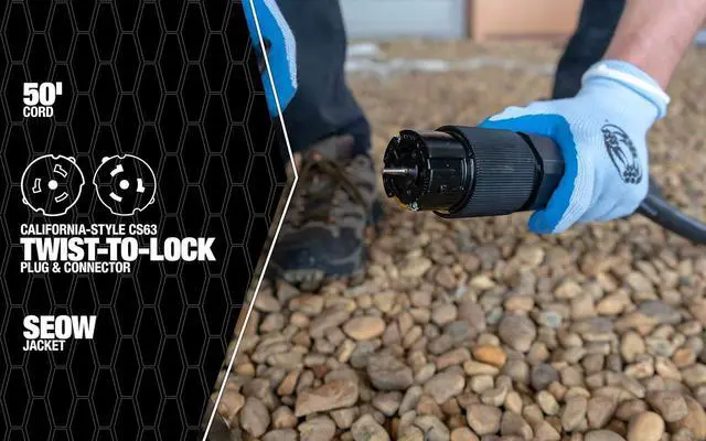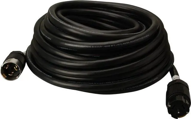 Quality Generator Extension Cord: This portable generator cord feeds a 50-amp power supply