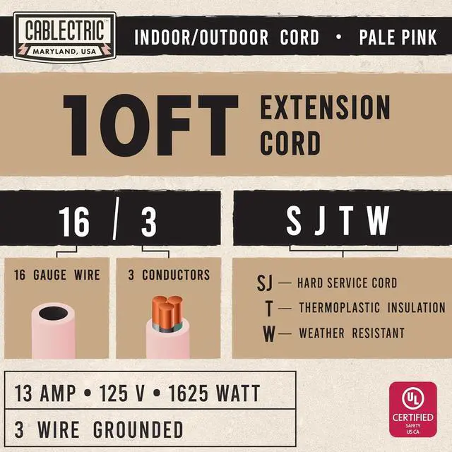 UL Certified: 16 gauge/16 awg, SJTW, 3 wire grounded, 10 foot long extension cord, pale pink cable, 13 amp, 125 volt, 1625 watt, 5-15P/R, nickel coated blades.