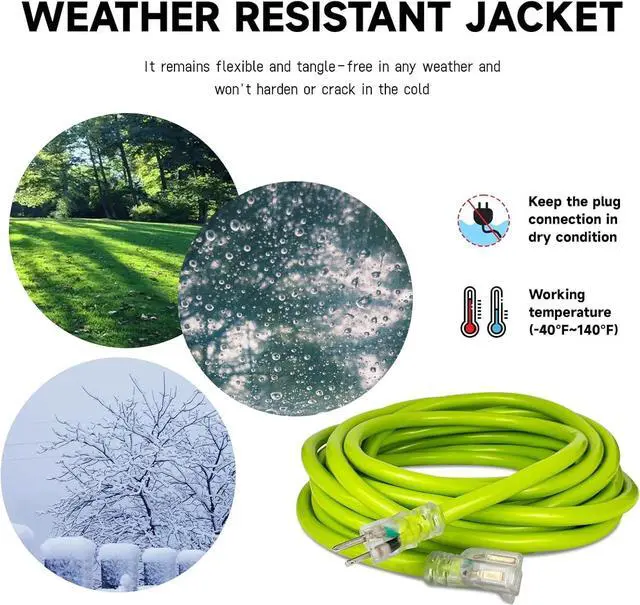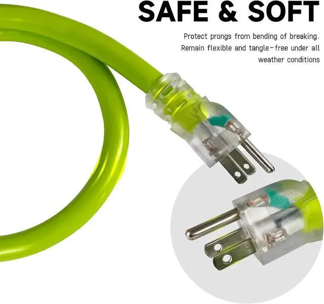Safe Cable - UL Listed, 3 prong grounded plug for added safety. Reinforced blades protect prongs from bending or breaking. Remain flexible and tangle-free under all weather conditions and wouldnt become stiff or crack in cold weather.