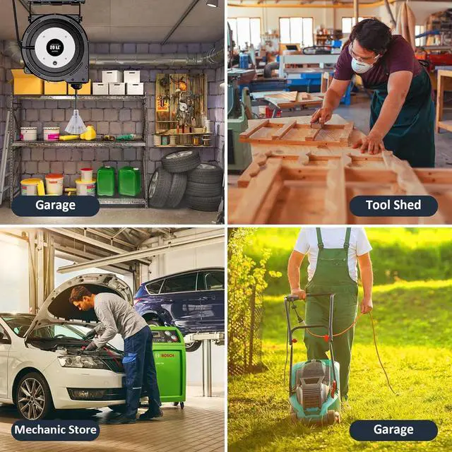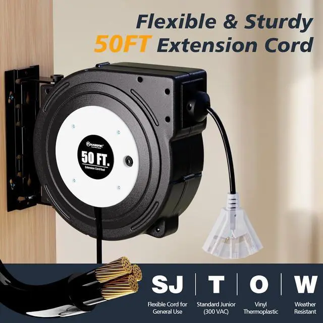 SJTOW retractable extension cord itself is flame retardant, tangle-free, and resistant to abrasion, water, oil, UV light, ozone, alkaline, and acid that you may find in a typical garage. keeps flexibility and durability in all temperature. Safety Certified, UL Listed.