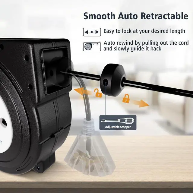 Automatic Retractable - With a clever auto-guide rewind mechanism to avoid kinks and tangles, the power cord reel will retract quickly and smoothly, the ratcheting system will lock the cord at any length; cord reel also comes with an adjustable stopper, keeps the cord neat and out of the way and your space clutter-free. 4.5 feet lead-in cord ensures the reel can be mounted in the desired location without needing any additional extensions to the wall or ceiling outlet.