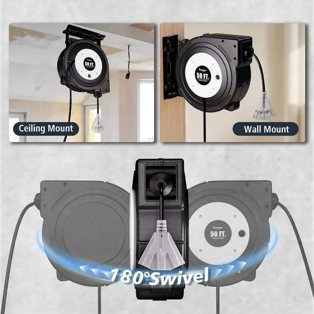 180 degree Swivel Ceiling/Wall Mounting with Bracket - swivel mounting bracket allows you to easily pull and release cord from multiple directions gives you a lot of conveniences so you can work in any direction; the retractable cord reel can be mounted on the ceiling or wall easily with a separate bracket.