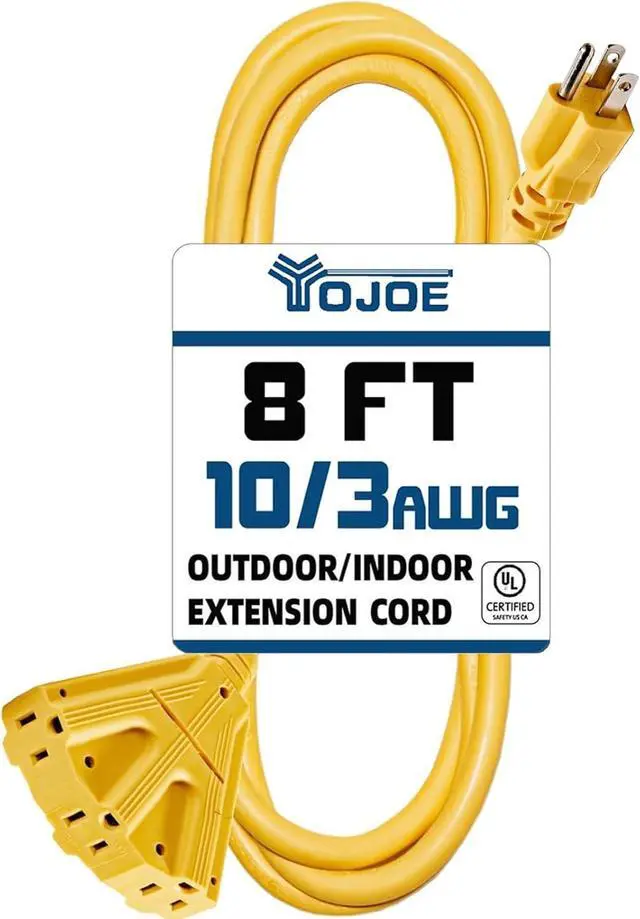 : This Yellow 8FT extension cord with 3 OUTLETS is a reliable choice. It features a 10 gauge build with a 3-prong grounded plug supporting 15 amps, 125 volts, and 1875 watts. Operating Temperature Ranges from -40°F to +140°F.