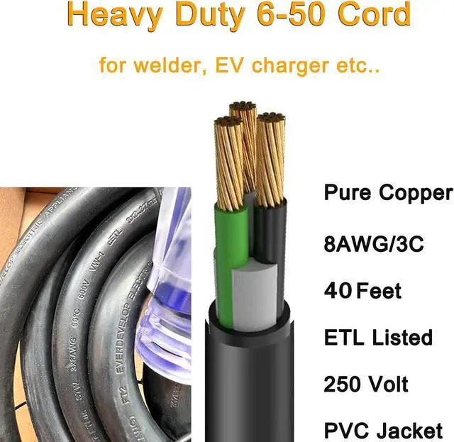 Welder Extension CordETL Listed, 50 amp NEMA 6-50 plug and 50 amp NEMA 6-50 receptacle. Rated at 40amp 250 volt 10, 000 watts welder cord, features excellent resistance to abrasion, oil and moisture as well as flexibility.