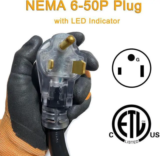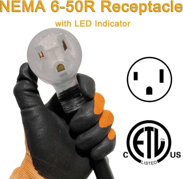 Welder Extension CordETL Listed, 50 amp NEMA 6-50 plug and 50 amp NEMA 6-50 receptacle. Rated at 40amp 250 volt 10, 000 watts welder cord, features excellent resistance to abrasion, oil and moisture as well as flexibility.