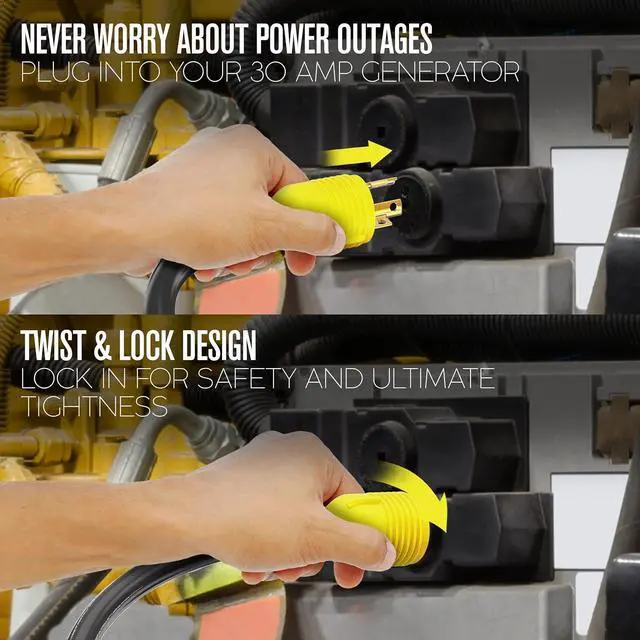 TWIST AND LOCK MECHANISM: 30 amp and 250 volt single phase NEMA L6 30 locking generator power cord. The locking plugs have the pins arranged in a circular manner. The plug is inserted and twisted to lock in place.