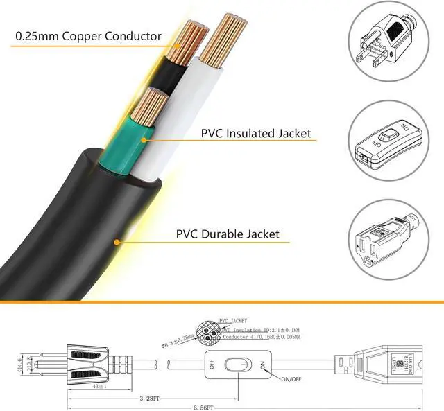 Plug and Receptacle: 3A, 125V, NEMA 5-15P and NEMA 5-15R grounded receptacle plugs and plugs, UL listed for safe and reliable use.