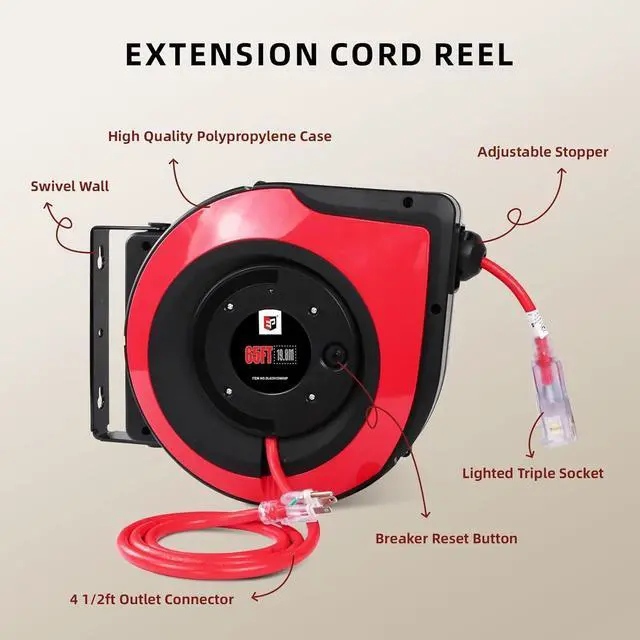 Use Conveniently - With a clever auto-guide rewind mechanism to avoid kinks and tangles, the power cord reel will retract quickly and smoothly; the ratcheting system will lock the cord at any length; cord reel also comes with an adjustable stopper.