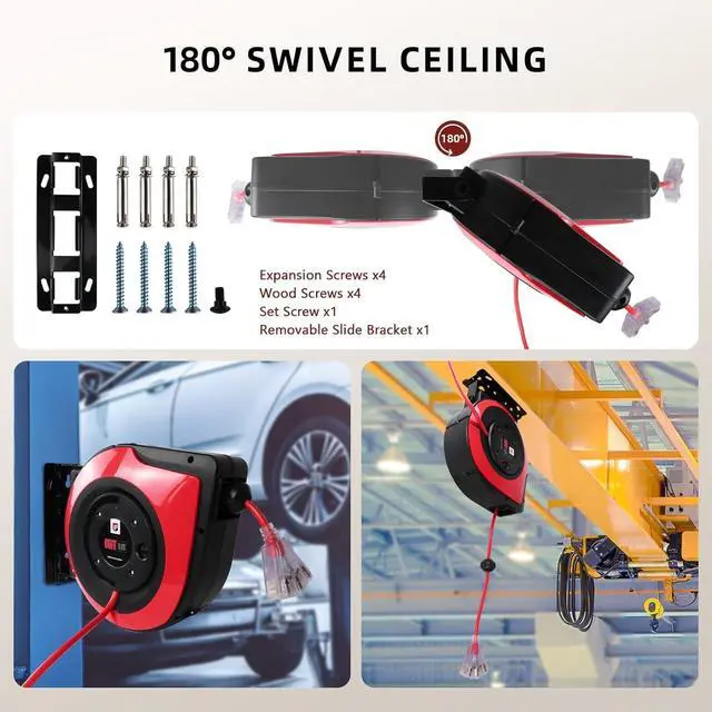 180°Swivel Ceiling/Wall Mounting with Bracket - 180 degree swivel mounting bracket allows you to easily pull and release cord from multiple directions; the retractable cord reel can be mounted on the wall or ceiling easily with a separate bracket