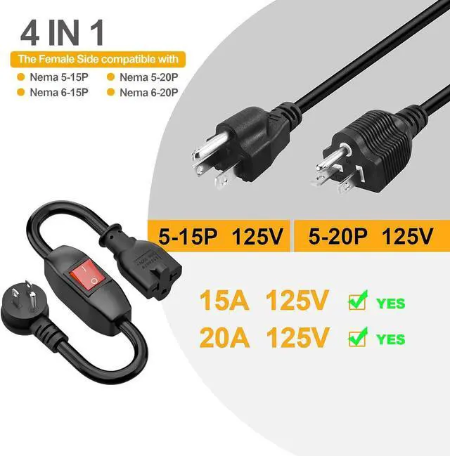 Heavy Duty 12AWG cord with double break 23A 125V/16A 250V on/off switch, Angled Nema 5-15P (3-Prong male) to 4-in-1 T-blade receptacle for your ev car charging. The On/Off [Double Break] switch rated @ [23Amp 125Volt and 16Amp 250V], 3 Outlet USA Canada extension power cord with 23-Amp/125Volt on off switch for your household 3-Prong power devices.