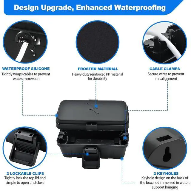 EASY TO USE: Simply put the connecting cable into the waterproof box, secure the cable with the clip, wrap the cable tightly with rubber and close the lid.