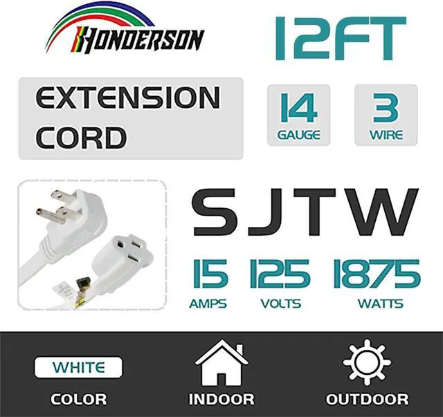 PERFORMANCE PARAMETER: White 12FT flat plug extension cord, 14gauge, 3 prong grounded plug, 15amp, 125volt, 1875watt.