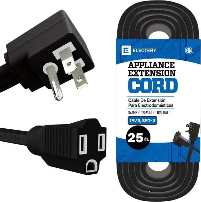 HIGH-QUALITY CORD - The 25 ft extension cord is made with thicker 14 AWG wire diameters which can handle more amperage, Get more from your heavy-duty 3-Prong extension cord with a high capacity of 1875 Watt rating (15 Amps, 125V). Link additional extension cords, power strips, surge protectors, plug adders, and devices up to a max of 1875W.