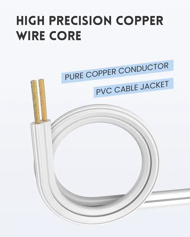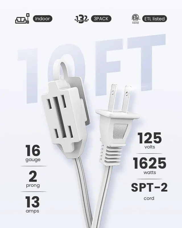 Specification 2-Prong Indoor extension cord, 16 gauge with 2 pure copper wire conductors, SPT-2, 13AMP/125V/ 1625W. ETL Listed for safe approval.