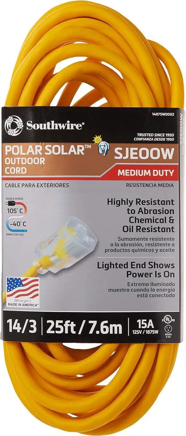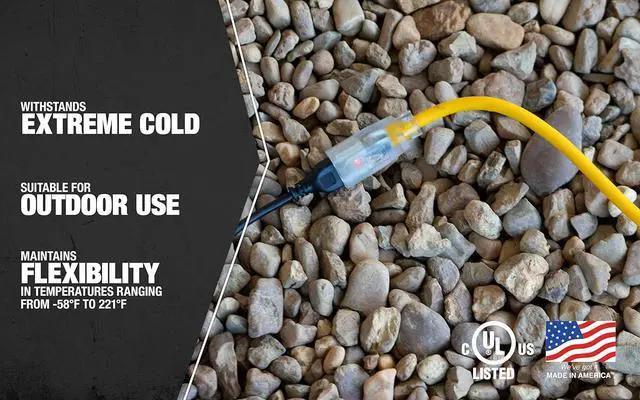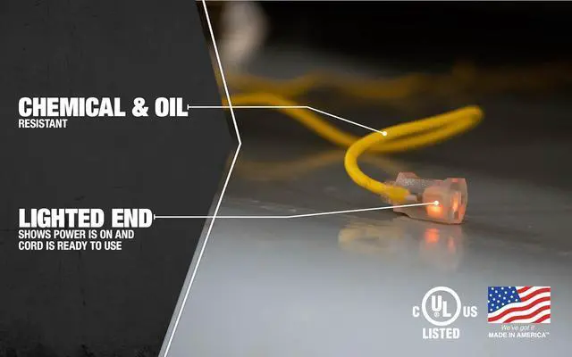 CHEMICAL AND OIL RESISTANT: Jacket provides protection of the cord against moisture; freezing; abrasion; and sunlight provides a POWERFUL 15 amps; 125 volts and 1875 wattsLIGHTED END indicates power is onUL LISTED and CUL LISTED