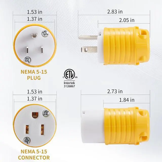Extension Cord EndsETL listed, NEMA 5-15P, 15A, 125V, 1875W, 2 pole, 3 wire, straight blade plug grounding type.