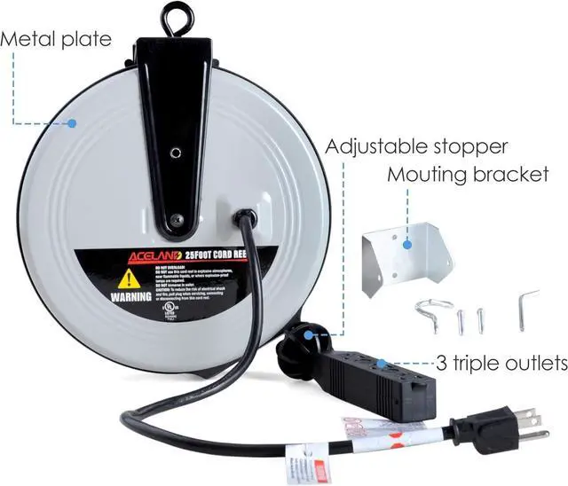 Safety Cord Reel UL ListedPlease be assured to use Aceland heavy duty electric extension cord with reel, it is UL listed. SJTW 16AWG* 3C, VW-1, 9A, 125V, 1125W cable with 3 triple grounded outlets.