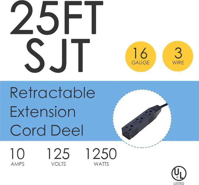 Weather Resistant 25 ft 16/3C Gauge Power Cord Aceland drop Cord Reel has 25 ft SJTW heavy duty extension cord covered with flexible vinyl coating, which protects the cord against moisture, abrasion, sunlight and cold weather. The 2 feet lead-in cord allows for longer reach from the reel to the power source. The retractable extension cord is durable, it is ideal for years general use.