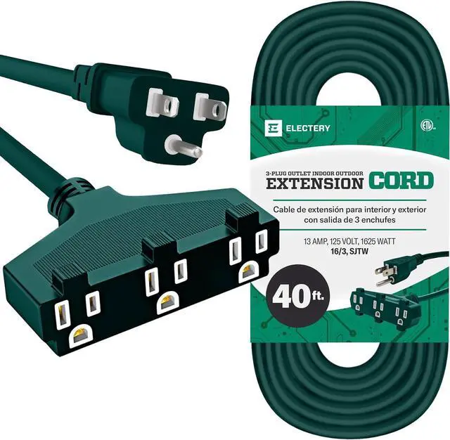 3 OUTLETS IN 1 EXTENSION CORD - Multiple outlet extension cord is made with thicker 16 AWG wire diameters which can handle more amperage, 13 Amps rated it is a standard NEMA 15-5-P grounded power plug/power cord and 3-pin female NEMA 5-15R connector Get more from your heavy-duty 3-Prong extension cord with a high capacity of 1625 Watt rating (13 Amps, 125V). Link additional extension cords, power strips, surge protectors, plug adders, and devices up to a max of 1625W.