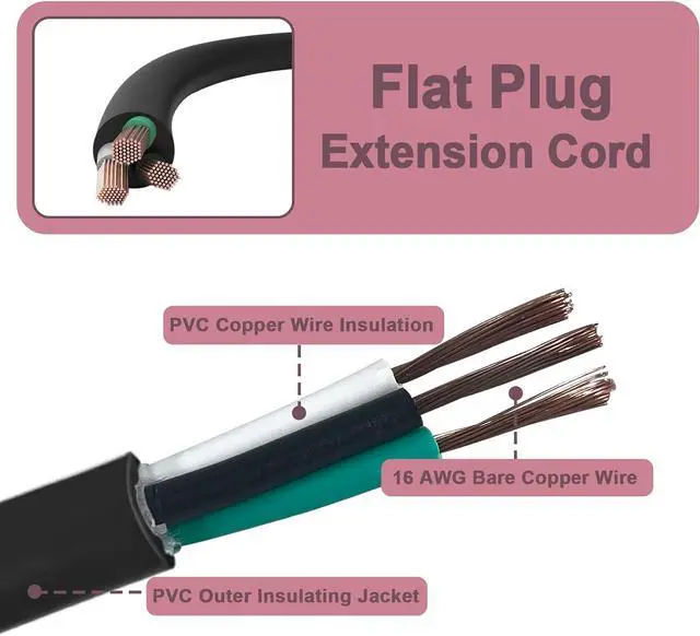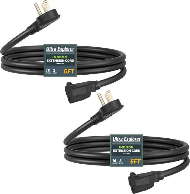 3 Pack Flat Plug Extension Cord 6 FT. Made of 16 AWG copper wire insulation and durable PVC material. 16/ 3 SJTW black extension cord. 13amp, 125V, 1625W.