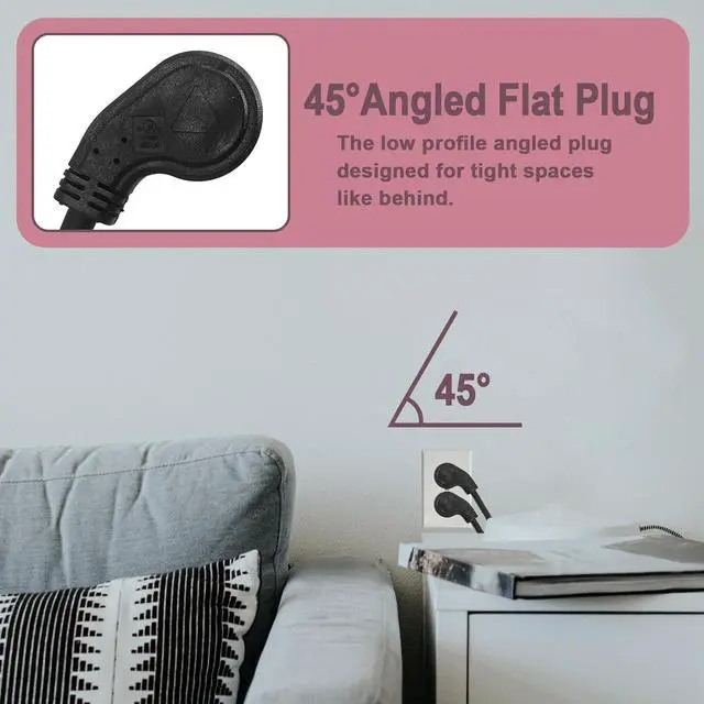 The low profile indoor extension cord plug is 45°angled to fit into a top outlet without blocking the bottom outlet and flat to fit easily behind furniture. You can easily push your furniture against the wall without damaging the plug.
