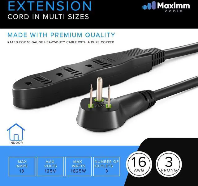 3-Outlet Extension Cord: This multiple outlet extension cord extends your AC wall outlet to three power outlets. Suitable for medium-duty tools and equipment not exceeding 1625 Watts like vacuum cleaners and leaf blowers, this power extension cord features 16AWG wire.