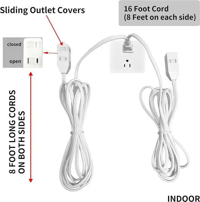 PRACTICAL DESIGN: Two parallel 16/2 extension cords extend from one end, each with 8 feet and 3 outlets, totaling 16 feet and 6 outlets. It has passed UL certification and performs well for indoor household, meeting the needs of electrical appliances such as Christmas lights.