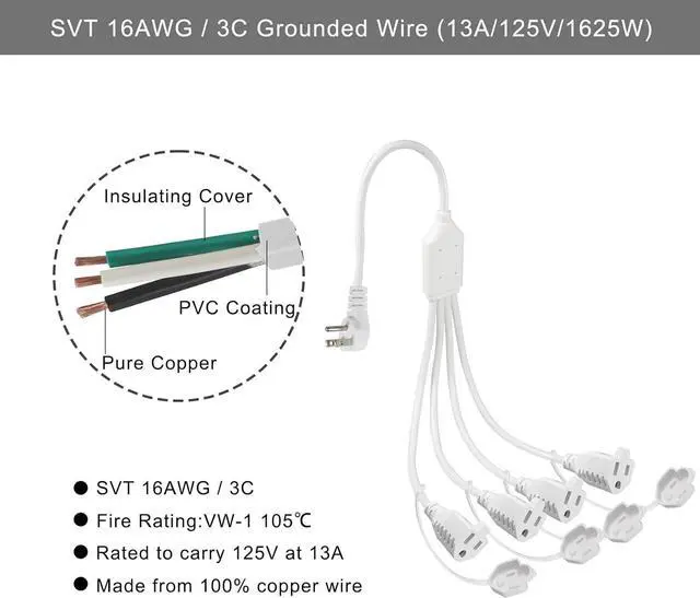 16/3C Gauge Cord Made of WHITE 16/3 gauge upgraded SVT wire, Flexibility, Easy and Convenient. Approved AC 125V / 13 AMP / 1625W power rated; built with all-copper wire, reinforced blades, and double jacketed cords; 16 AWG heavy duty cable allows you to power multiple appliances at the same time