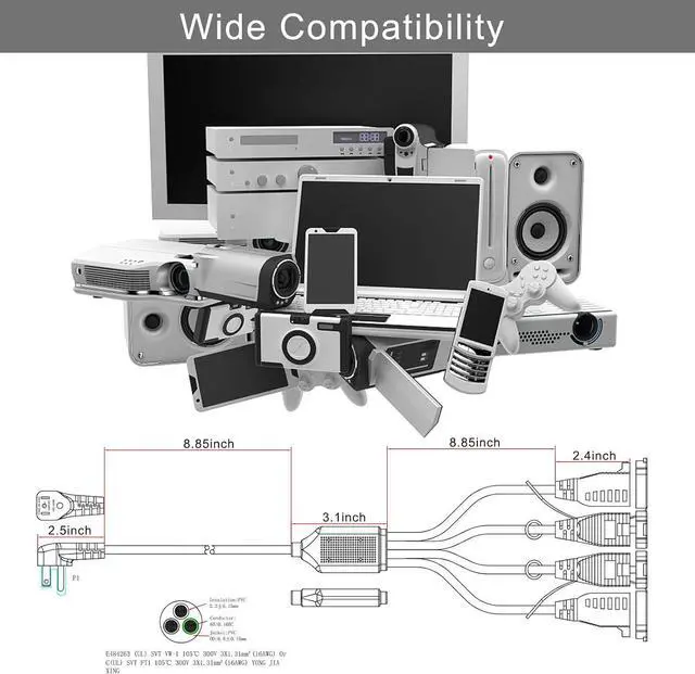 Wide CompatibilityKUNCAN Power cord splitter is ideal for expanding power options in areas with limited outlets for home offices, gaming centers, living room TVs workplaces where there is limited space for electronic equipment, like Computers, Monitors, Printers, Power transformers, Projectors, Entertainment Centers, Server Equipment, and other appliances. Also great for travelers that might need that extra outlet at the airport, office, or hotel room.